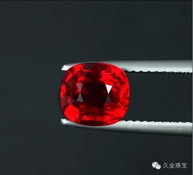 如果在暗处用聚光手电照射,显得象烧红的铁块一样通体红亮而看不清亭部的小刻面和交棱